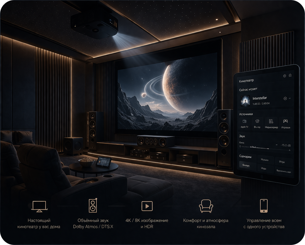 Интегрируем мультирум и домашние кинотеатры в единую мультимедийную систему дома. Музыка в нужных зонах, качественный звук, удобное управление и продуманные сценарии просмотра создают пространство, в котором технологии работают естественно и без лишней сложности.