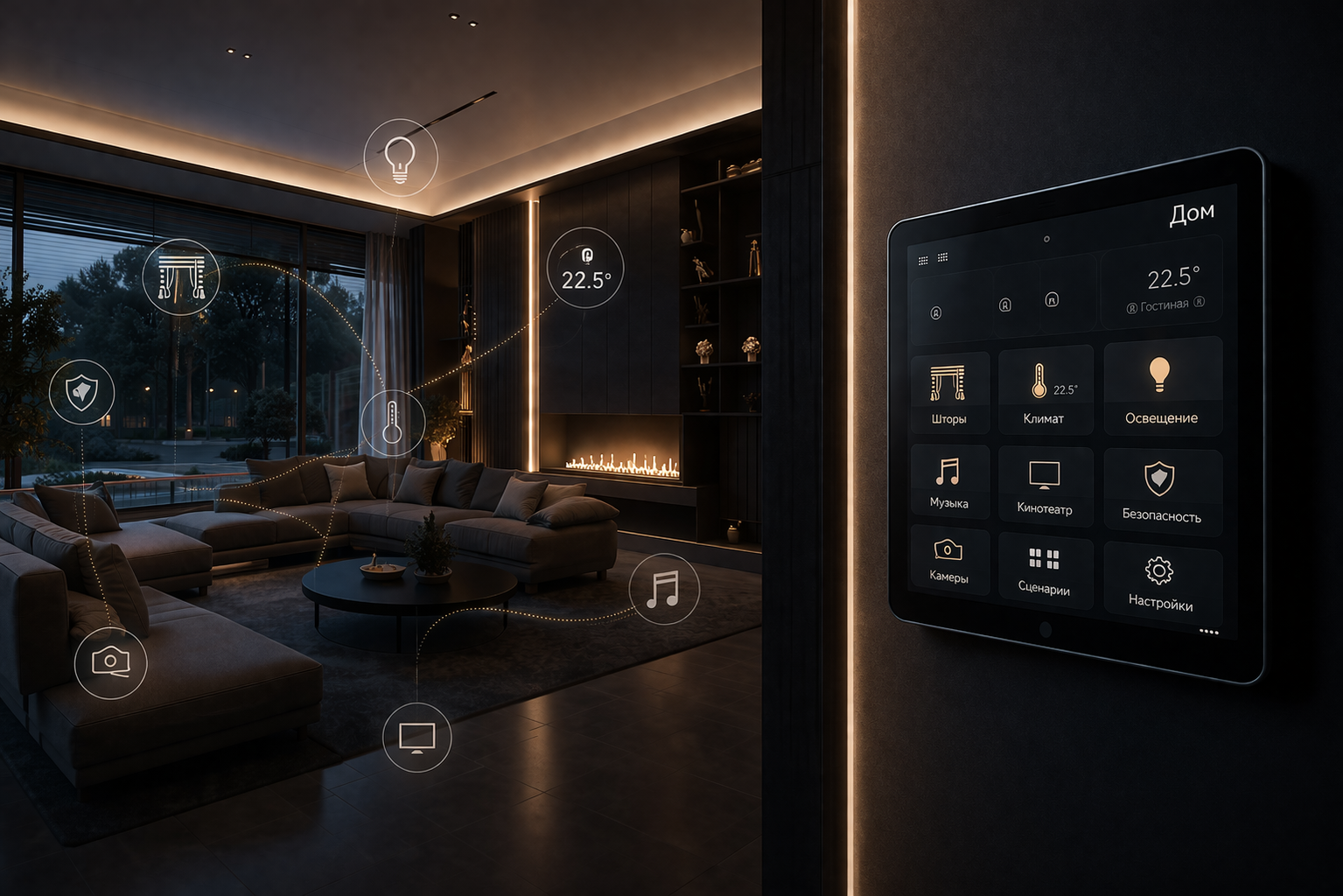 Интеллектуальная система управления домом объединяет все основные функции объекта в одном понятном интерфейсе. Свет, климат, шторы, безопасность, мультимедиа и инженерные системы работают согласованно и управляются с панели, телефона, планшета или через заранее настроенные сценарии. Мы проектируем умный дом не вокруг отдельных устройств, а вокруг повседневных задач клиента. Утренние и вечерние сценарии, режимы “дома” и “никого нет”, управление одним нажатием, автоматические действия по времени, освещённости, присутствию или событиям — всё это делает пространство удобнее, безопаснее и технологичнее.